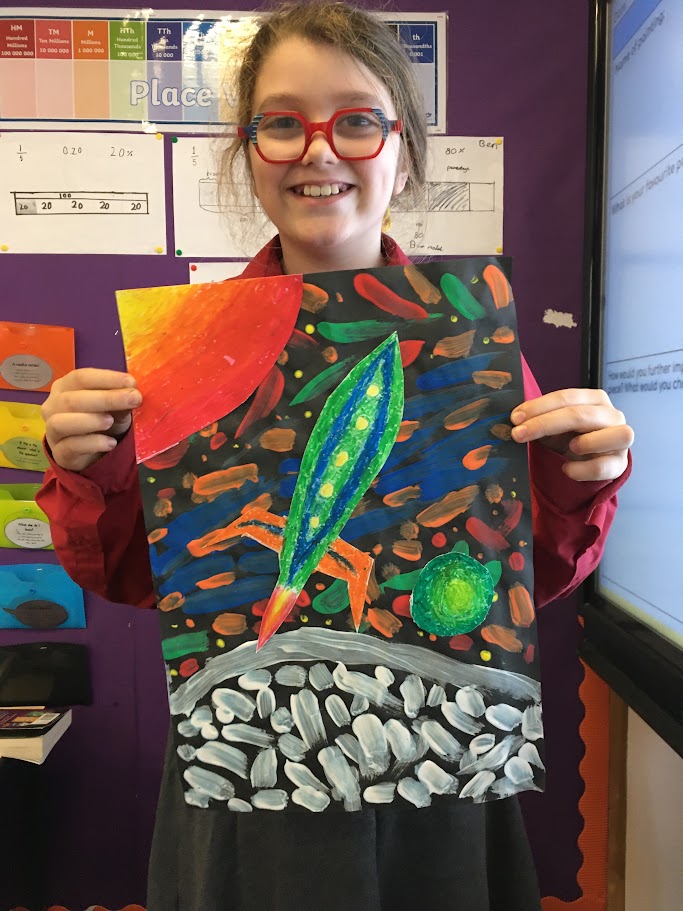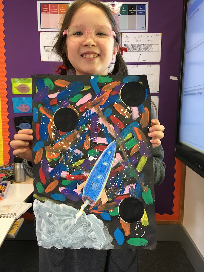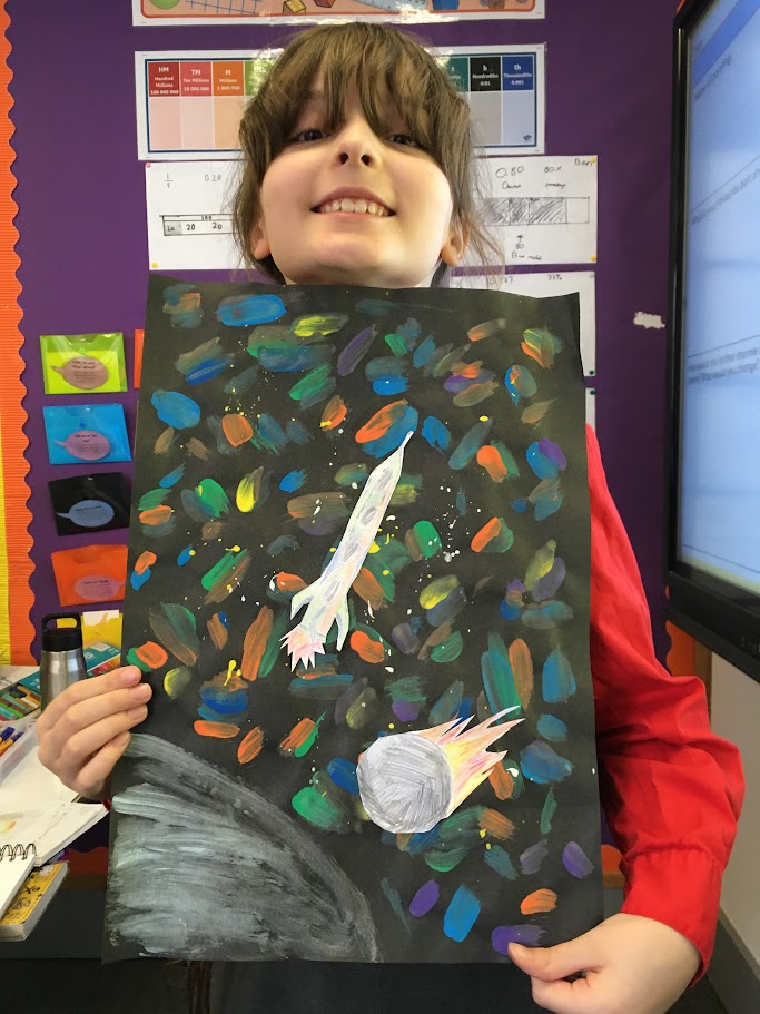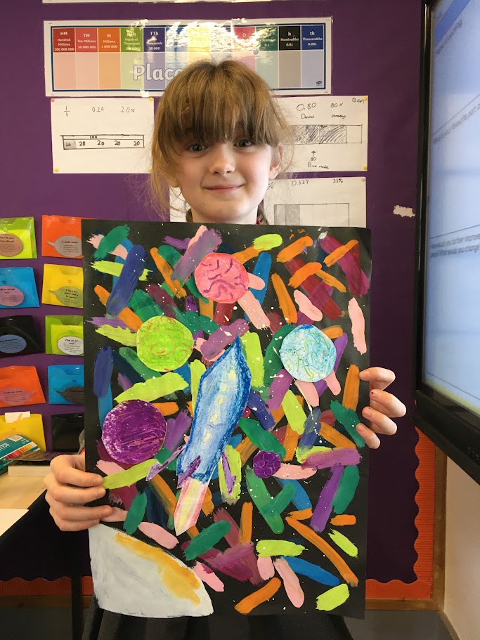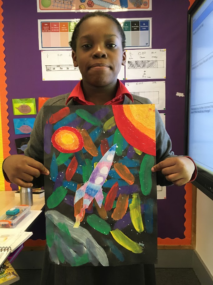 Most of his paintings are space related and he loves to paint rockets. We used his paintings as inspiration and then designed and created our own. Peter Thorpe’s style was that the background is abstract whereas the foreground is more realistic. We loved this project and are really pleased with the outcomes.