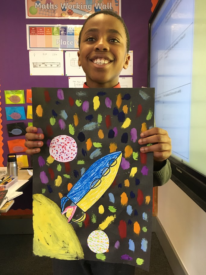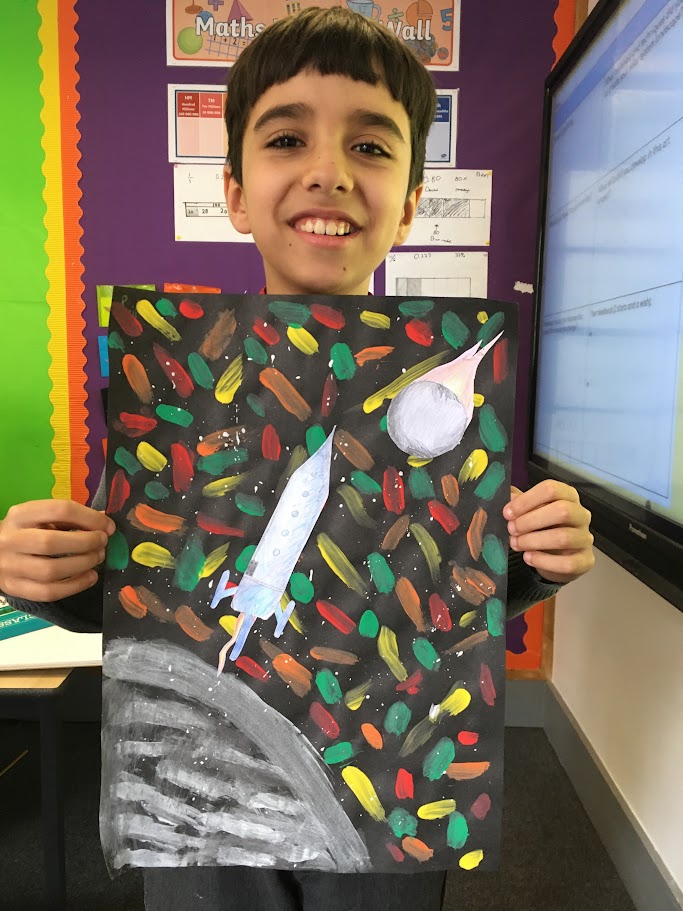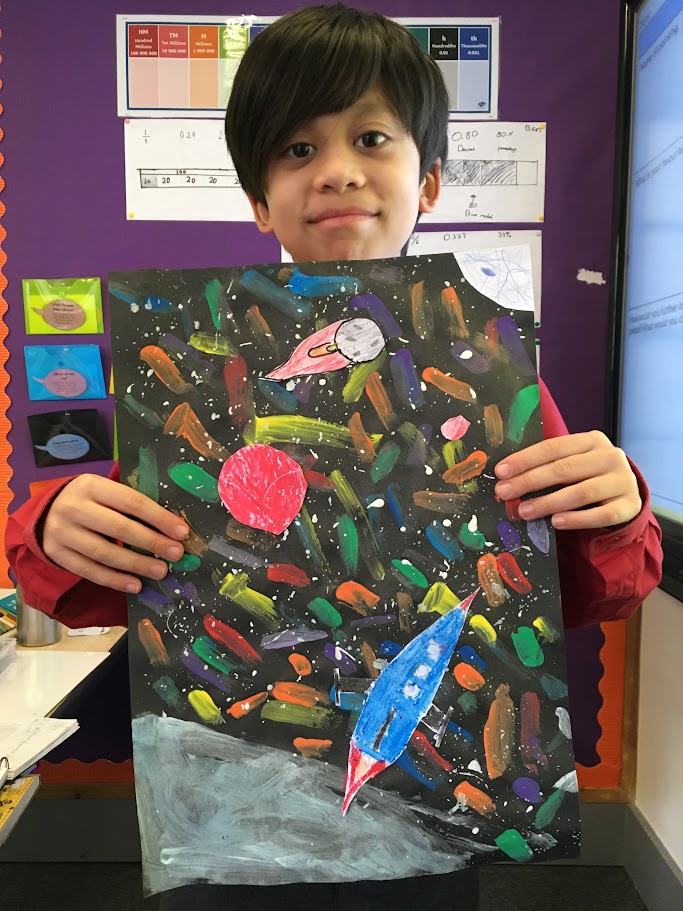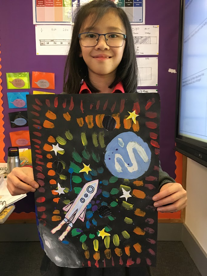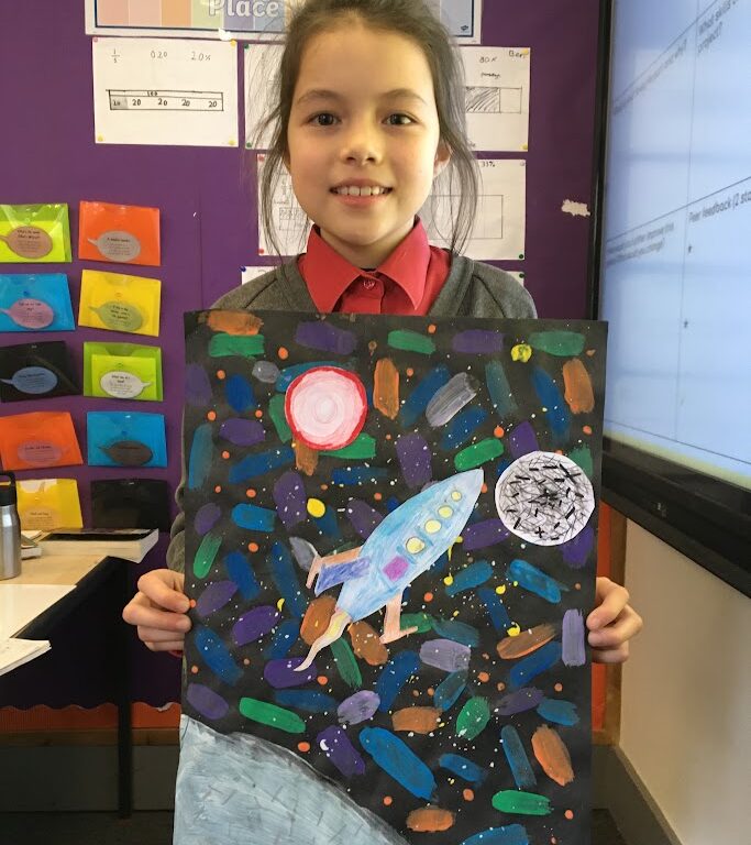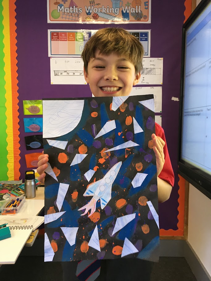 Most of his paintings are space related and he loves to paint rockets. We used his paintings as inspiration and then designed and created our own. Peter Thorpe’s style was that the background is abstract whereas the foreground is more realistic. We loved this project and are really pleased with the outcomes.