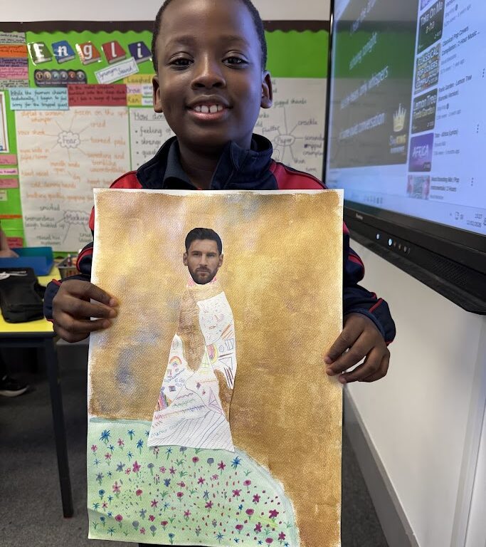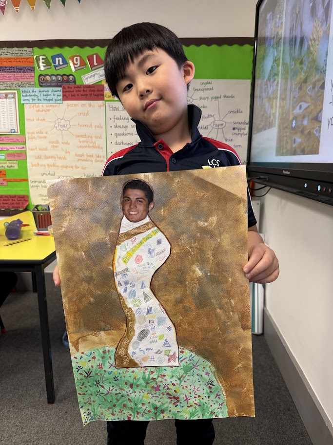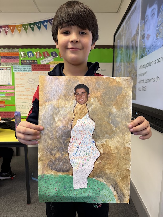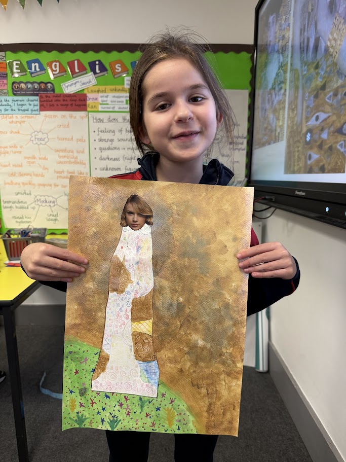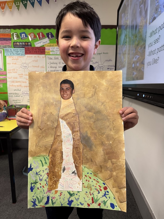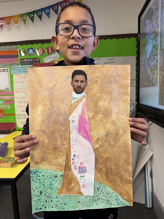 We studied two of his paintings, ‘Adele Bloch-Bauer’ and ‘The Kiss’, looking at the colours, patterns and style Klimt used. We then made our own version with a celebrity of our choice and used inspiration from both paintings.