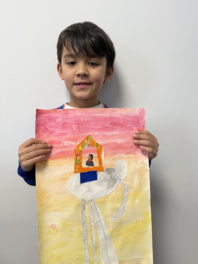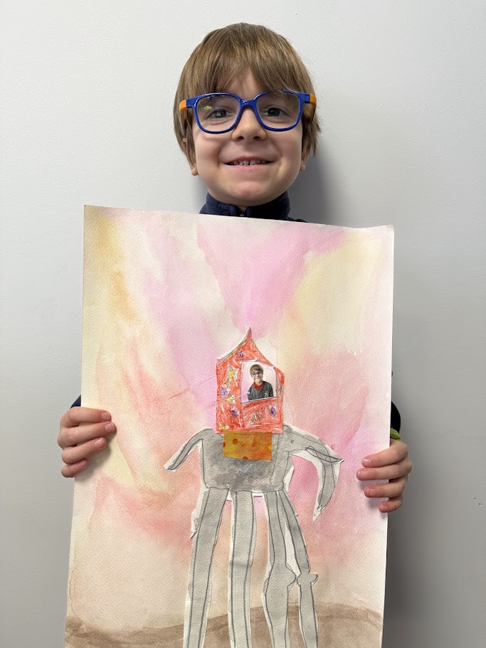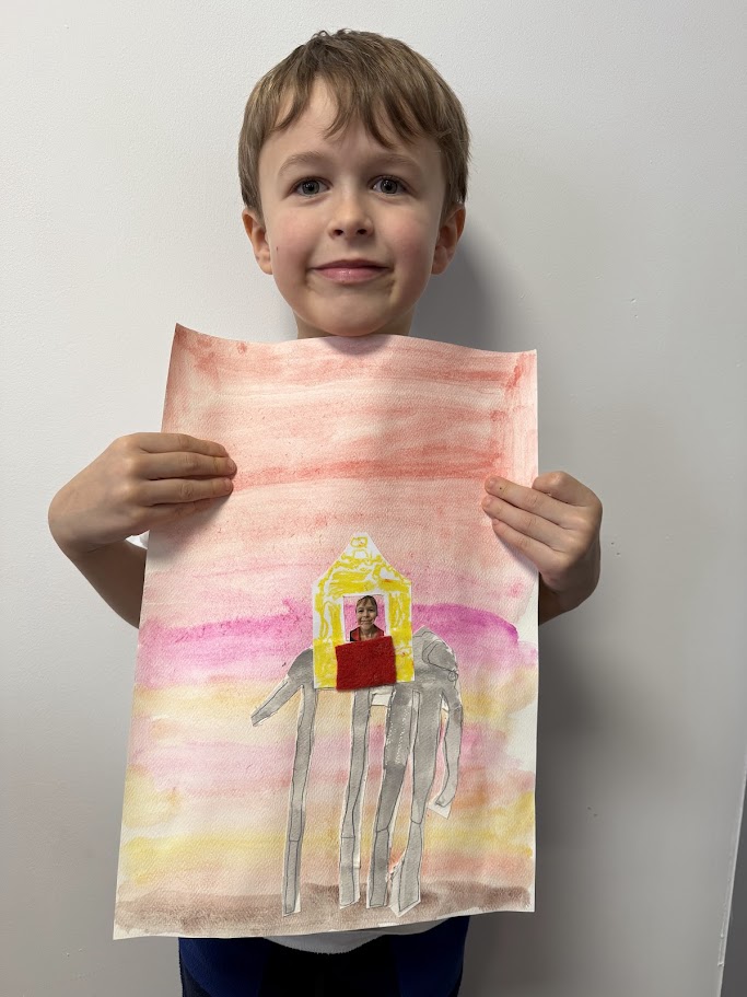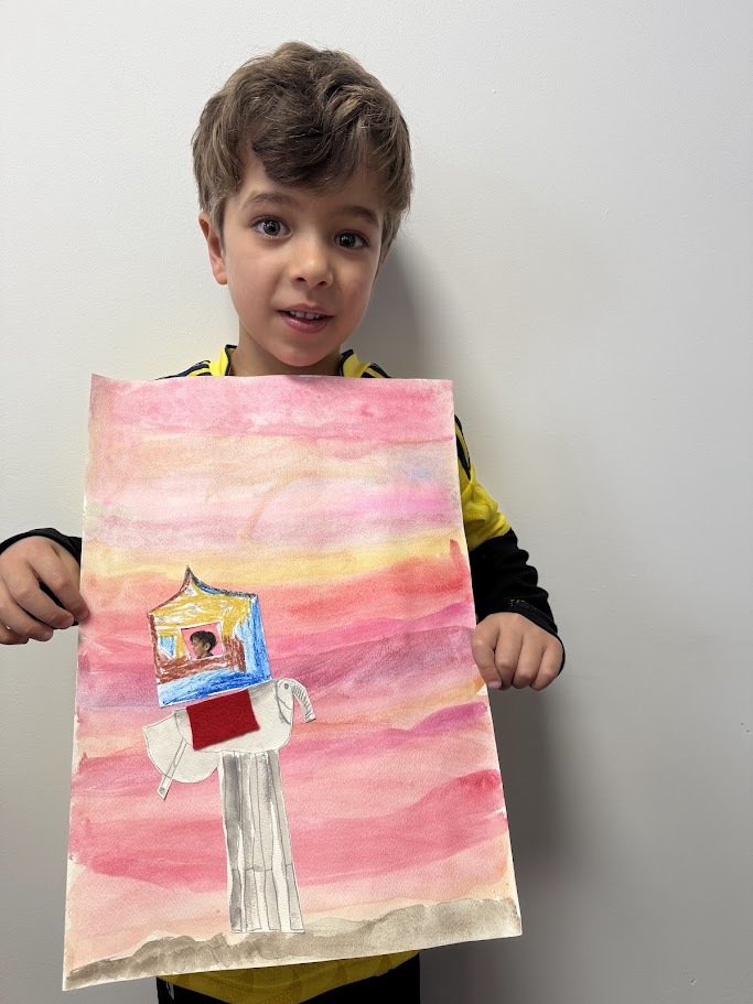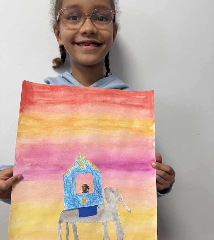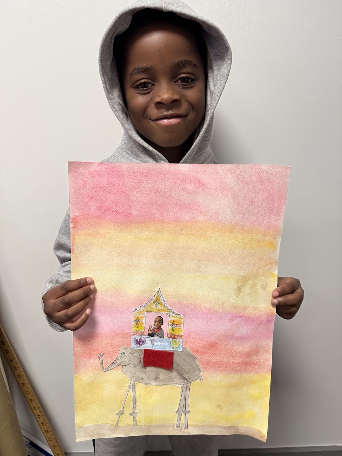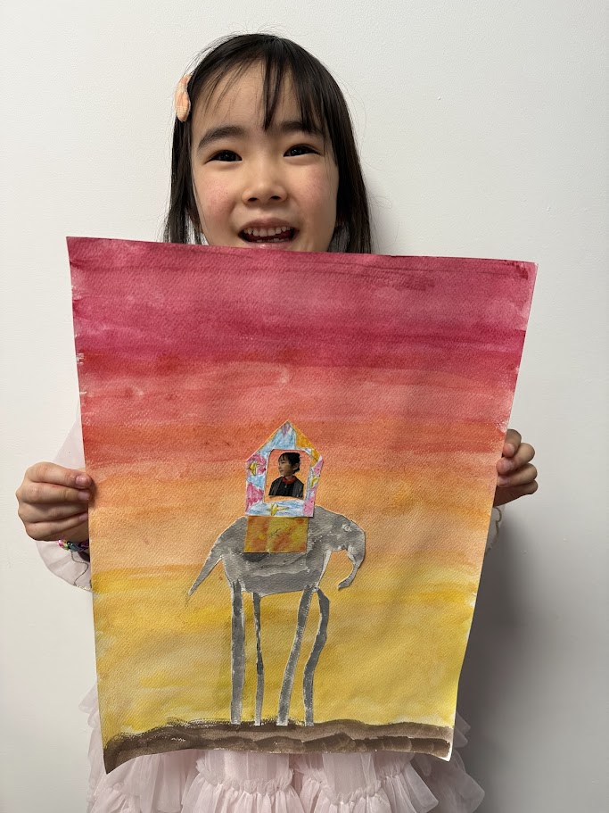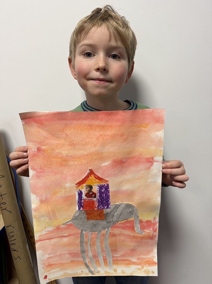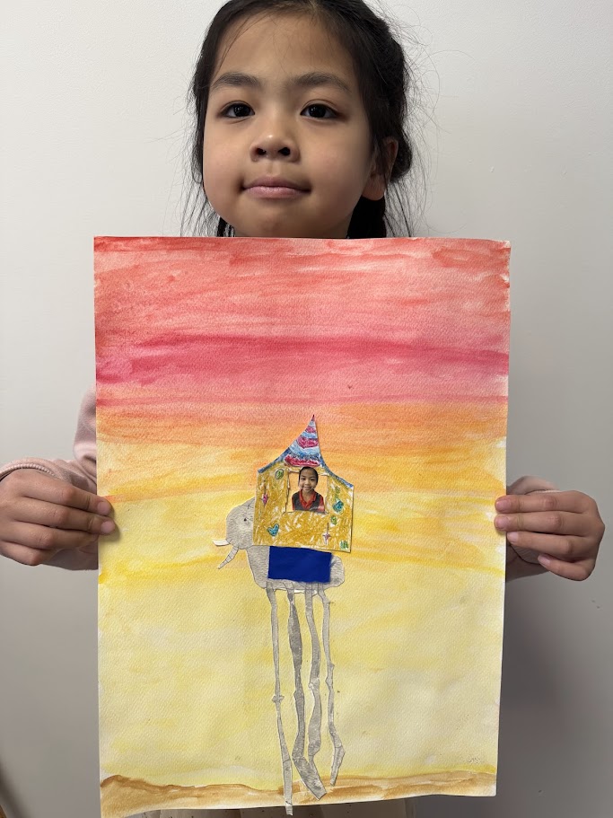 We used watercolours for the sunset background then created our elephants. They had to have long, spindly, out of proportion legs like Dali’s. We had fun posing for our photo and designing our own howdahs. We hope you enjoy them!